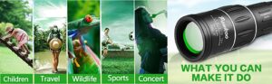 • 【16X52高清放大】16倍放大倍率和52毫米物镜直径的单筒伸缩盒,提供清晰的图像和不同的视野,非常适合徒步旅行、登山、观鸟、球赛、音乐会、旅行、观赏野生动物和风景。