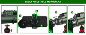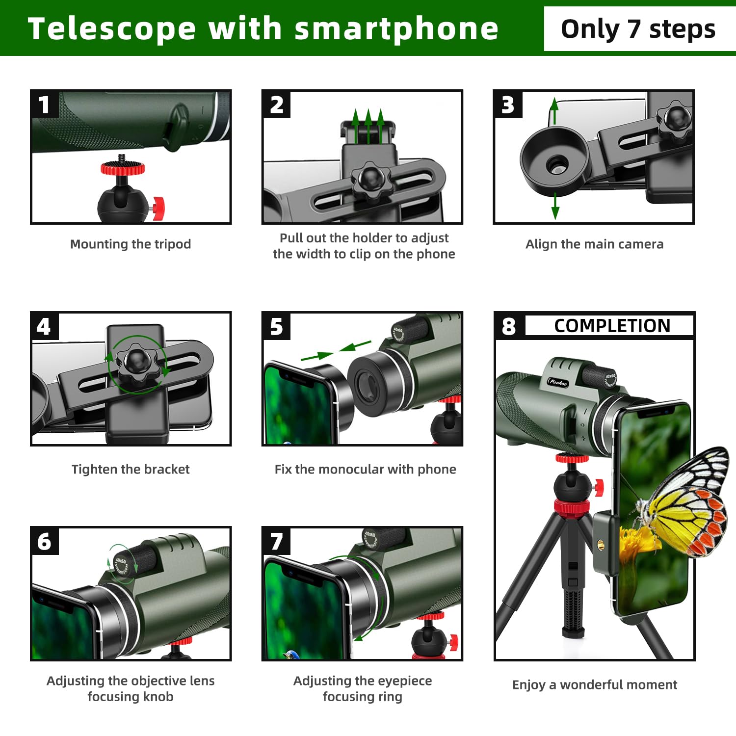- 【Monocular Widely Compatible With Smartphone】Comes with quick alignment smartphone holder, tripods, Compatible with smartphone, Easy to install, remote control monocular, provide HD images to share with your friends.e with smartphone